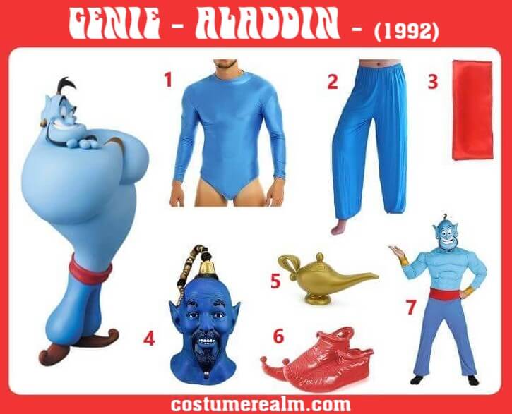 - How to Do It: Start with the blue bodysuit and pants to mimic Genie's skin. Wrap the red sash around your waist to replicate his iconic belt.